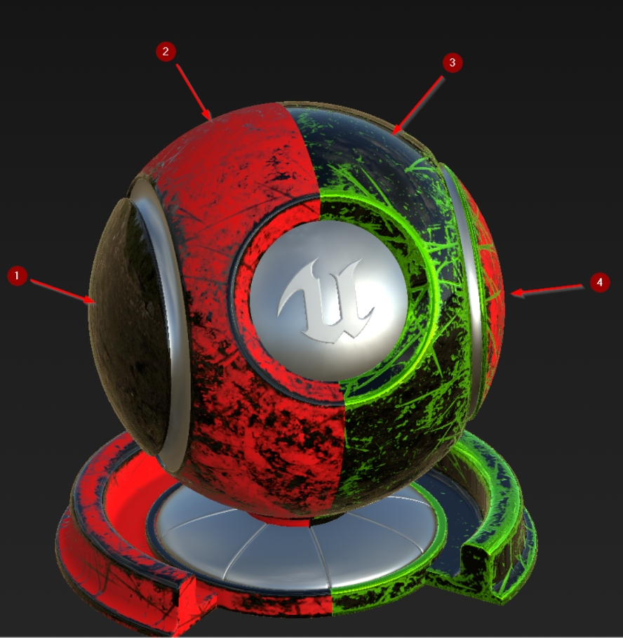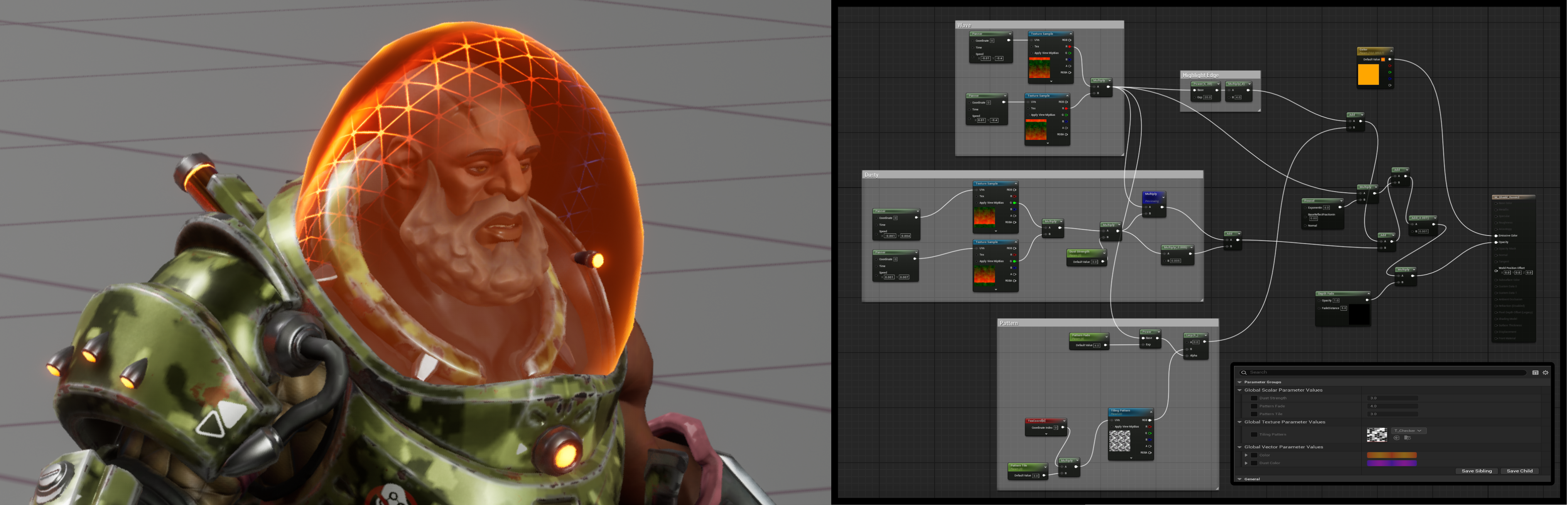 The shield effect shader allowed for customizable colors and included a switch to ping-pong the effect, giving it a scanning appearance. Controls were exposed to adjust the falloff for various elements and to swap out the tiling pattern. This shader was applied to both small assets, like helmets, and larger ones—such as the shield that blocked players from progressing further in the level.