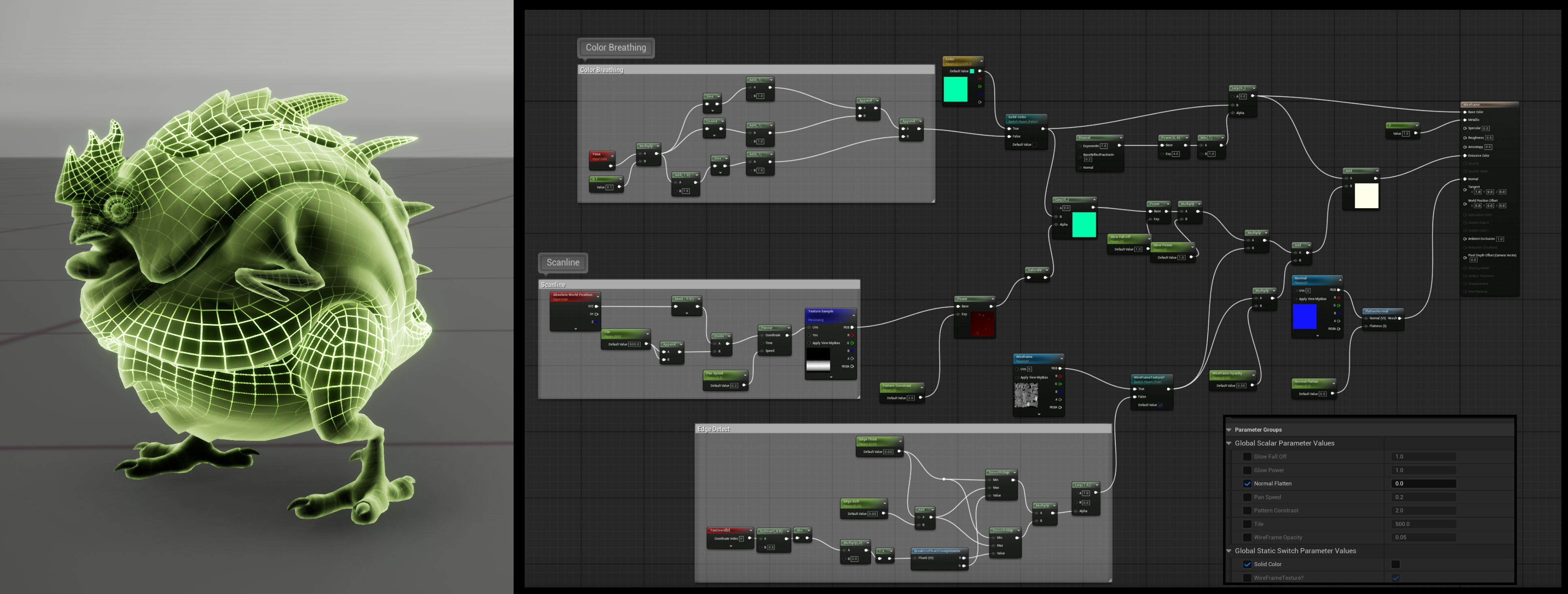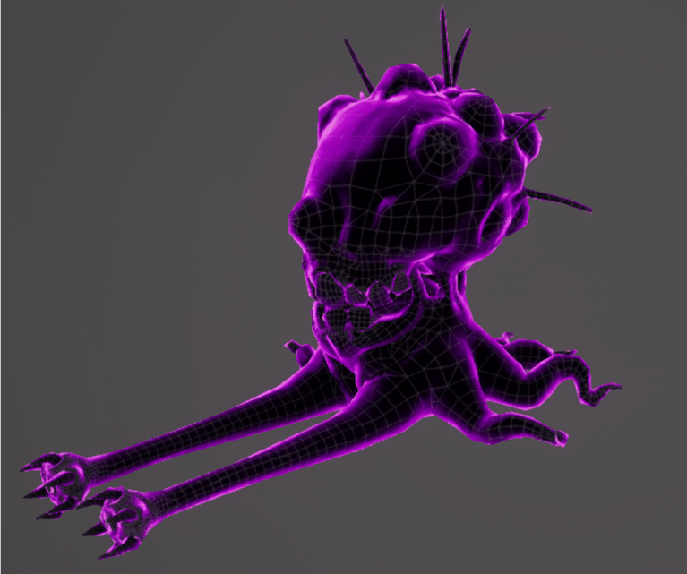 The wireframe shader could be toggled to either cycle through colors or display a solid color. It was available in both forms and used in the tutorial level. Eventually, every character was intended to have this wireframe shader as an option..